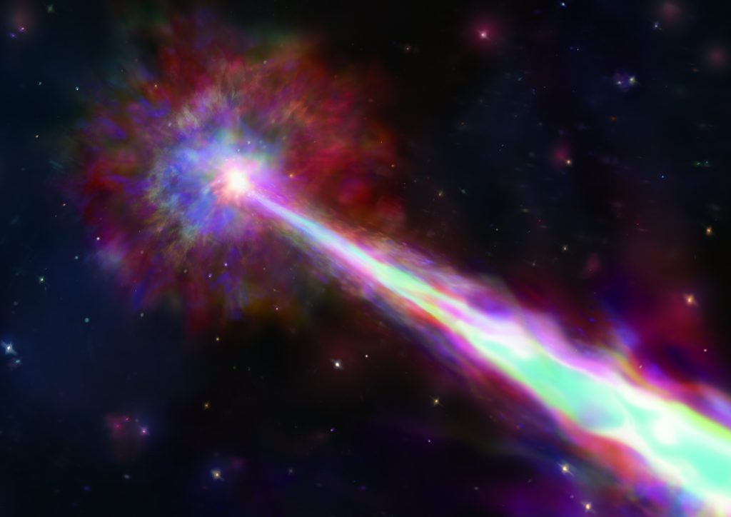 中心のエンジンであるブラックホールから超高速の粒子流「ジェット」が吹き出ている様子。(Credit:東京大学宇宙線研究所/若林菜穂)